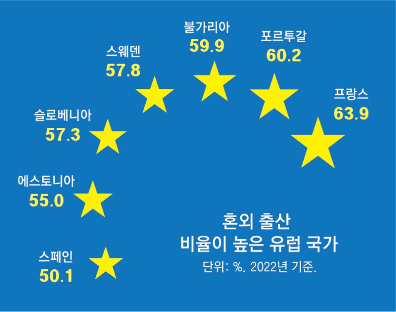 최근 국내에서 배우 정우성 씨로 인해 비혼 출산에 대한 찬반 논란이 일고 있는 가운데 비혼 출산 비율이 절반을 넘으며 일반화되고 있는 유럽 국가들이 주목받고 있다. 특히 신생아의 약 63.9%가 비혼 부모에게서 태어나는 프랑스에선 정부의 육아 혜택이 혼인 여부와 상관없이 동일하게 적용된다. 체코와 헝가리 같은 비혼 출산 비율이 상대적으로 낮은 유럽 국가들도 최근 비혼을 아우른 ‘한부모 가정’ 지원 정책을 다양하게 내놓기 시작했다.