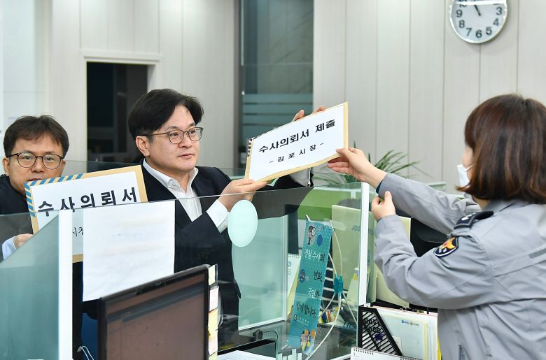 지난 3월 13일 오전 김병수 경기 김포시장이 항의성 민원에 시달리다 숨진 공무원과 관련해 김포경찰서에 수사의뢰서를 제출하고 있다. /연합뉴스 |