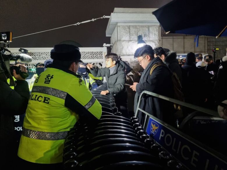 이날 밤 다급하게 국회에 도착한 국회의원들은 국회 안으로는 들어서는 모습이었다. 고민정 더불어민주당 의원은 경찰에 가로막혔다가 “고민정 의원입니다”를 외치며 국회 안으로 들어갔다. 조국 조국혁신당 대표도 경찰 방패 사이로 다급하게 국회 정문으로 들어갔다. 김기현 국민의힘 의원이 국회 정문을 향하자 시민들은 “국힘도 똑같아!”라고 외치며 다소간 충돌이 빚어지기도 했다.