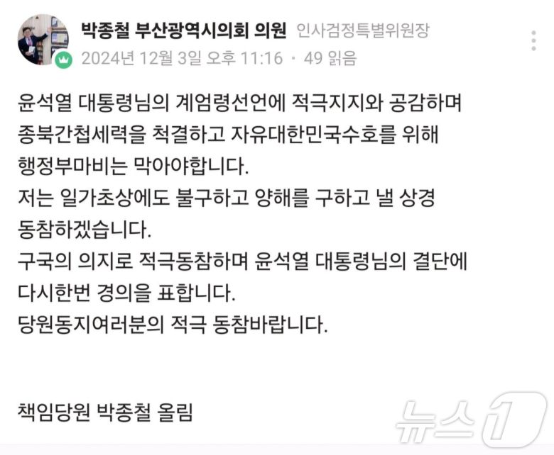 박종철 부산시의원이 SNS에 올린 계엄 지지 글(독자 제공) |