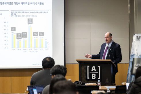 거숀 디슨펠드 AB 인컴 전략 부문 이사가 3일 서울 여의도 전경련회관에서 열린 AB자산운용의 ‘글로벌 경기·하이일드 채권시장 전망’ 간담회에서 주제 발표를 하고 있다./사진제공 = 얼라이언스번스틴(AB)자산운용 |