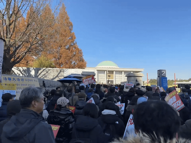 머니투데이 취재에 따르면 4일 오전 11시쯤 서울 영등포구 여의도 국회 앞에 모여 있던 수백명의 시위대 행렬이 국회 안으로 진입했다. 국회 2문 앞을 지키던 경찰이 통행로를 열어주며 시위대와 경찰 간 대치는 발생하지 않았다. 국회 본관으로 이동하는 시민들./영상=김호빈 기자