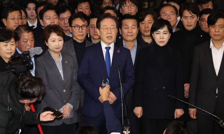 윤석열 대통령이 3일 밤 긴급성명을 통해 비상계엄을 선포한 가운데 4일 새벽 서울 영등포구 여의도 국회에서 비상계엄 해제요구 결의안 통과 후 더불어민주당 이재명 대표가 입장을 밝히고 있다. 연합뉴스 |