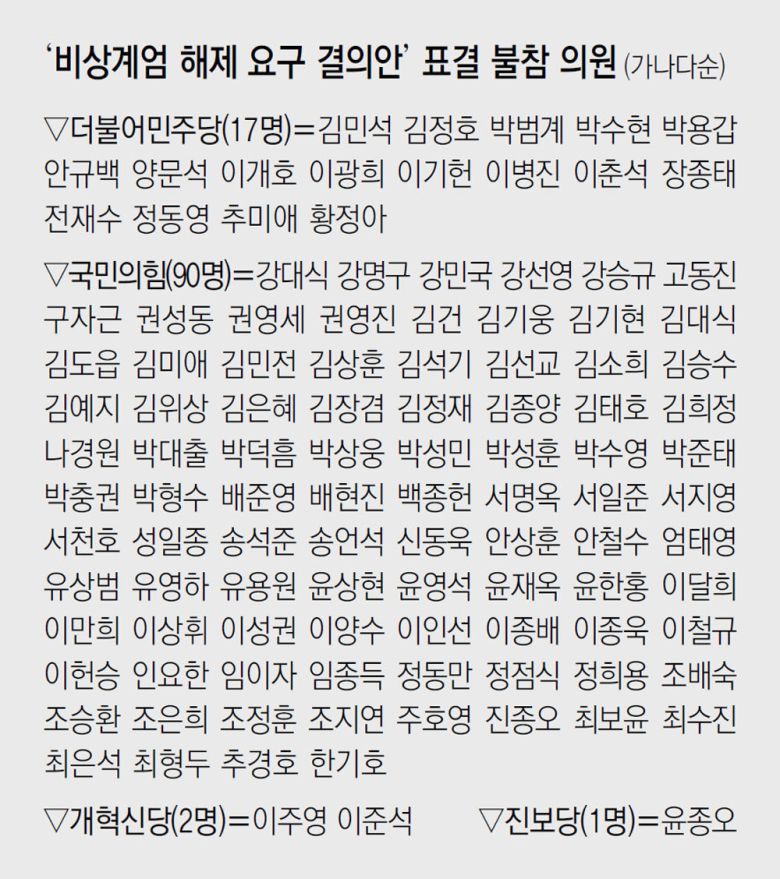 4일 오전 1시 국회 본회의에서 처리된 ‘비상계엄 해제 요구 결의안’ 표결에는 국회의원 300명 중 190명이 참석해 전원 찬성표를 던졌다. 국민의힘 90명, 더불어민주당 17명, 개혁신당 2명, 진보당 1명 등 총 110명이 불참했다. 국민의힘에서는 추경호 원내대표를 비롯해 권성동 권영세 김기현 김은혜 나경원 안철수 유상범 윤재옥 윤한홍 이철규 정점식 주호영 의원 등 90명이 표결에 불참했다. 추 원내대표는 “(국회로) 들어오려고 시도하다가 결국 진입이 되지 않아 당사에 많은 사람이 있었다”고 설명했다. 국민의힘이 국회 앞 당사에서 비상 의원총회를 진행하면서 뒤늦게 국회로 향했기 때문이다.