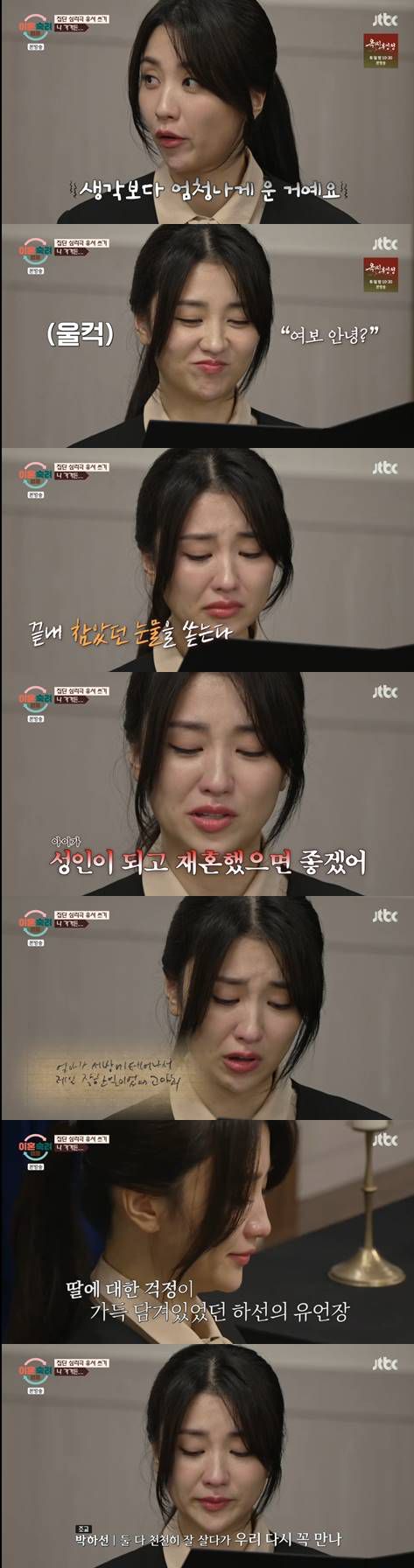 5일 방송된 JTBC 예능 프로그램 '이혼숙려캠프'에서는 출연 부부들과 함께 MC 진태현, 박하선이 유서를 쓰고 읽는 시간을 가졌다.