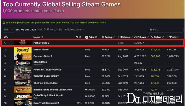 6일 스팀DB에 따르면 POE2는 출시 전날인 이날 스팀에서 글로벌 최고 판매 게임 부문 1위에 올랐다. 앞서 판매한 사전 구매 패키지 구매에 많은 이용자 관심이 쏠린 결과다.