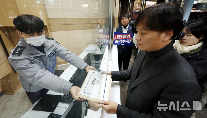 [서울=뉴시스] 추상철 기자 = 이태형 더불어민주당 법률위원장이 6일 오후 서울 서대문구 경찰청에서 '추경호 국민의힘 원내대표의 내란죄(부화수행) 혐의' 고발장을 접수하고 있다. 2024.12.06. scchoo@newsis.com