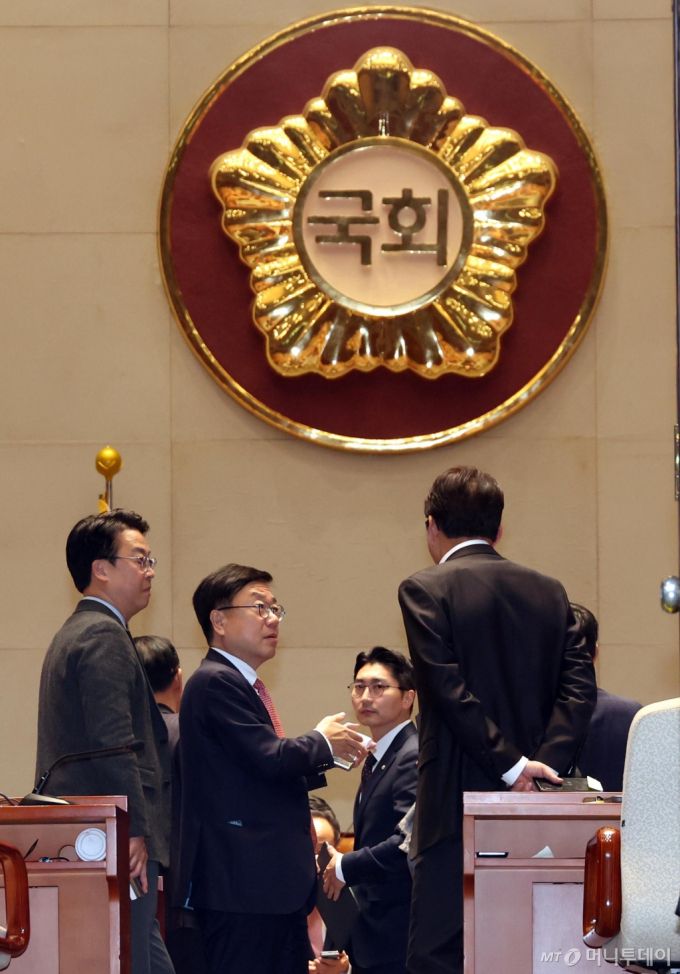 서범수 국민의힘 사무총장이 6일 오후 서울 여의도 국회 예결위장에서 열린 비상의원총회에서 동료의원들과 대화를 하고 있다. 2025.12.06. /사진=뉴시스 |