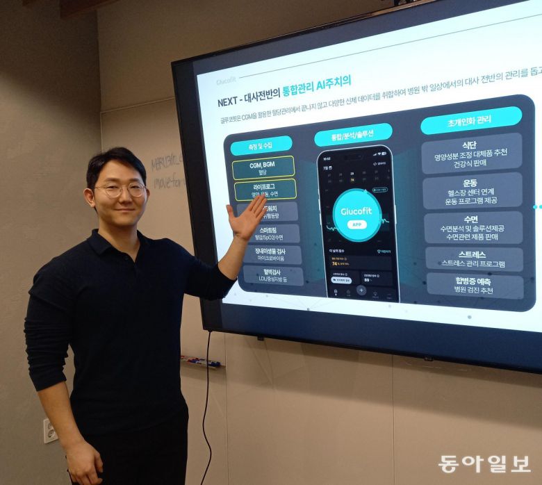 양혁용 대표가 2일 자사 글루코핏 서비스의 미래에 대해 설명하고 있다. 양 대표는 연속혈당측정기와의 연동을 넘어 여러 웨어러블 진단기기 및 혈액검사, 장내미생물검사 등과 연계해 병원 밖의 예비 환자들이 진짜 환자가 되지 않도록 하겠다는 꿈을 품고 있다. 허진석 기자 jameshur@donga.com |