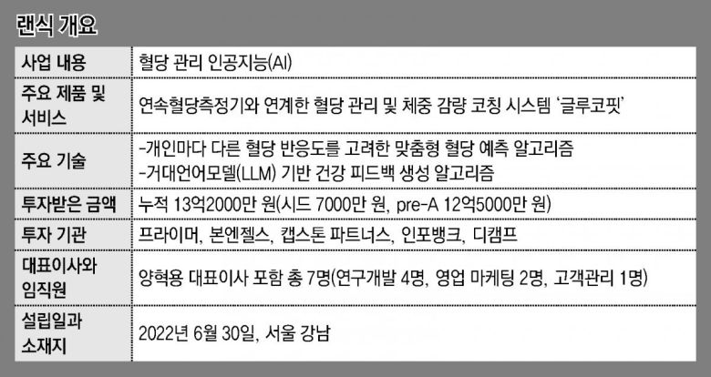랜식은 글루코핏이라는 서비스로 혈당 관리와 비만 관리를 돕는다. 혈당을 연속으로 측정하는 기술을 이용해 혈당 예측 AI를 만들었다. 연속혈당측정기를 계속 사용하지 않더라도 섭취하는 음식의 사진을 찍으면 언제쯤 얼마나 혈당이 오르는지 알려준다. 양 대표는 “AI 기술 덕분에 음식 사진만으로도 95%의 정확도로 혈당을 예측한다”고 했다. 당뇨병이 있거나 당뇨 전 단계인 사람들은 물론이고 살을 빼서 더 건강해지고 싶은 사람들이 대상이다. 그는 “혈당이 급격하게 오르지 않도록 하고, 평균 혈당을 적절하게 관리하면 살은 1개월에 3∼4kg 정도는 빠진다”고 했다.