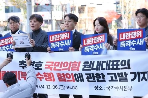 더불어민주당 관계자들이 6일 오후 서울 서대문구 경찰청 국가수사본부 앞에서 국민의힘 추경호 원내대표의 내란죄 위반 혐의 관련 고발 기자회견을 하고 있다. 연합뉴스 |