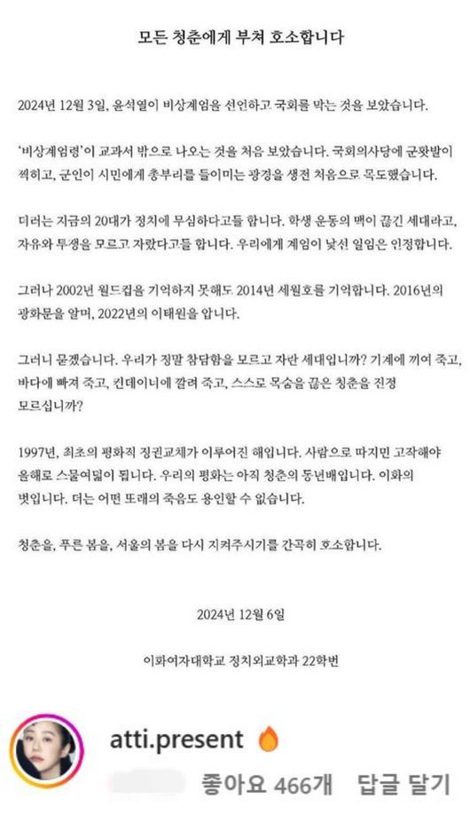 이화여대 학생들은 “2024년 12월 3일, 윤석열이 비상계엄을 선하고 국회를 막는 것을 보았습니다. 비상계엄령이 교과서 밖으로 나오는 것을 처음 보았습니다. 국회의사당에 군홧발이 찍히고, 군인이 시민에게 총부리를 들이미는 광경을 생전 처음으로 목도했습니다”라고 말했다.