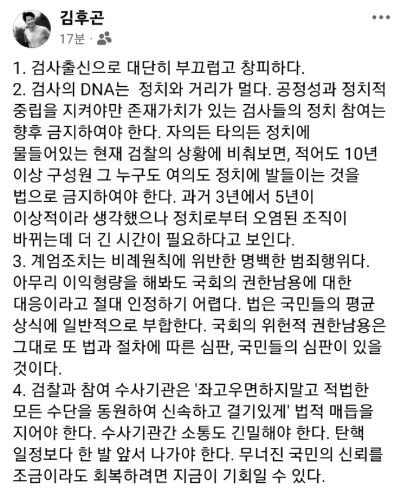 김 전 고검장은 " 검찰과 참여 수사기관은 '좌고우면하지말고 적법한 모든 수단을 동원하여 신속하고 결기있게' 법적 매듭을 지어야 한다"며 "수사기관간 소통도 긴밀해야 한다. 탄핵 일정보다 한 발 앞서 나가야 한다"고 썼다. "무너진 국민의 신뢰를 조금이라도 회복하려면 지금이 기회일 수 있다"는 게 그의 글이다.