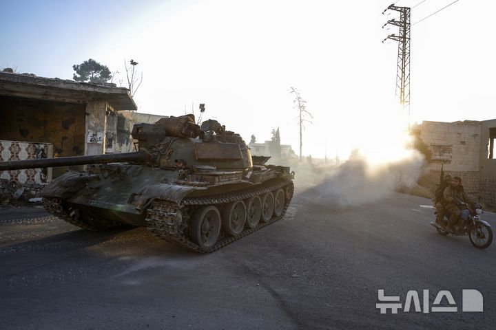 [마아랏 알누만=AP/뉴시스] ?최근 주요 도시를 속속 점령하고 있는 시리아 반군이 7일(현지시각) 수도 다마스쿠스를 포위하기 시작했다고 AFP통신이 보도했다. 사진은 지난 3일 시리아 이들리브 남부 마아랏알누만에서 시리아 반군이 정부군으로부터 탈취한 전차를 몰고 있는 모습. 2024.12.7