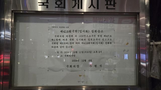 몇몇 시민들은 국회 담벼락에 설치된 게시판 위 공고문을 보며 향후 일정에 대해 이야기하기도 했다. 게시판에는 제419회 임시회의 일정이 담긴 공고문이 부착돼 있었다. ‘국회의원 박찬대 외 169인으로부터 헌법 제47조 제1항에 따른 국회 임시회의 집회요구가 있으므로 국회법 제5조 제1항에 따라 제 419회국회(임시회) 집회를 다음과 같이 공고함'이라는 내용이다.