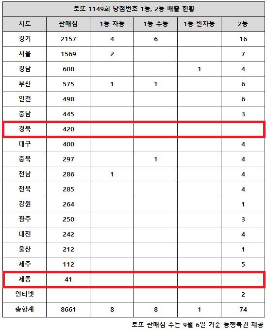 동행복권이 7일 추첨한 로또 1149회 당첨번호 조회 결과 1등은 17게임, 2등은 74게임이다. 전국 17개 시도 중 경북, 세종 지역에서는 로또 고액(1,2등) 당첨 판매점이 단 한 곳도 나오지 않았다.