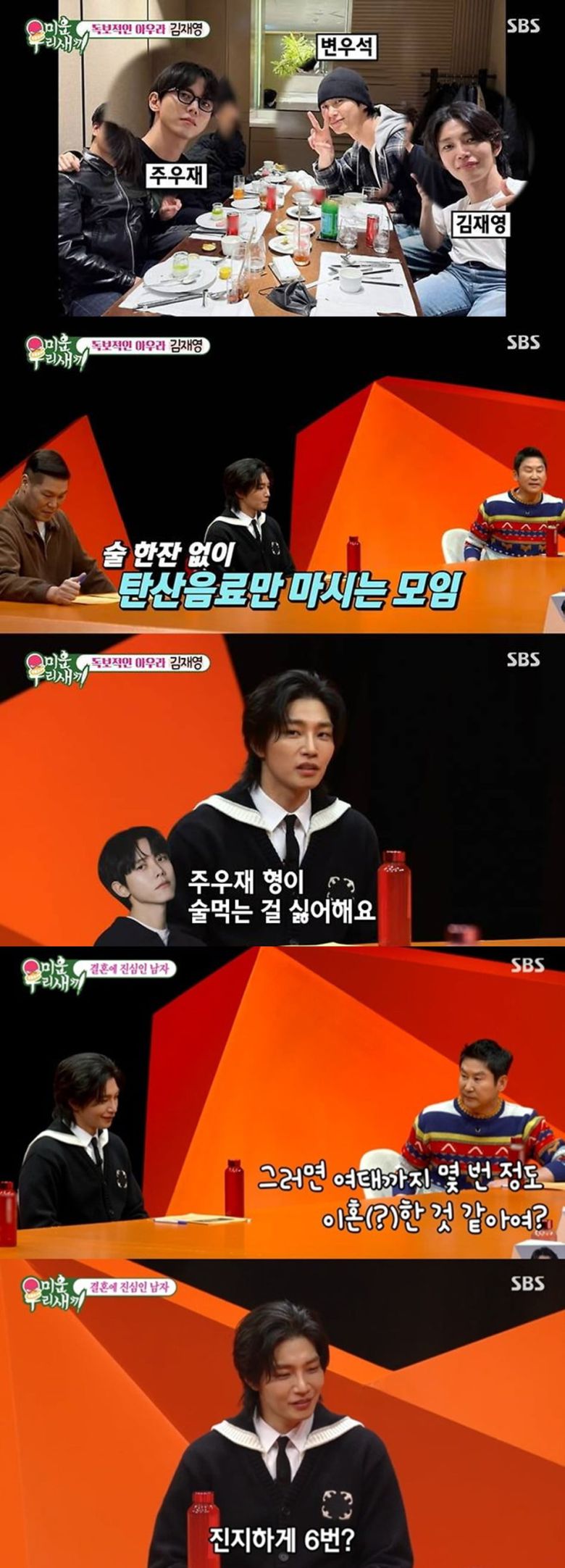 모델 출신 배우 변우석, 주우재와 절친인 김재영은 탄산음료만 먹어 화제가 된 '연말 모임' 비하인드 스토리도 밝혔다. 김재영은 "주우재 형이 술 먹는 걸 싫어한다. 남이 먹는 것도 별로 안 좋아한다. 그래서 모이면 술을 잘 안 먹는다"고 설명했다.