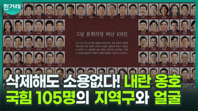 이런 상황이 부담스러워서일까요? 어째선지 현재 국민의힘 누리집에서는 소속 의원들의 얼굴 사진을 찾아볼 수 없습니다. 그래서 한겨레는 유튜브 공간에도 역사적 기록을 남긴다는 차원에서 이 105명 의원의 얼굴 사진과 명단을 담은 영상을 만들었습니다. 많은 시청 바랍니다.