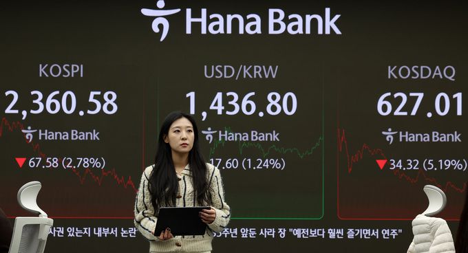 서울 중구 하나은행 딜링룸 전광판에 지수가 표시되고 있다. 사진=뉴시스 |