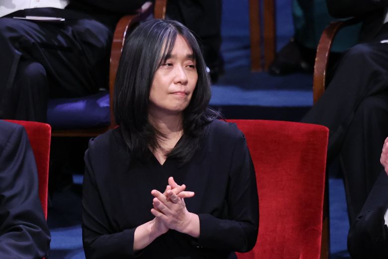 한강이 10일 스웨덴 스톡홀름 콘서트홀에서 열린 2024 노벨상 시상식에서 박수를 치고 있다. /뉴스1 |