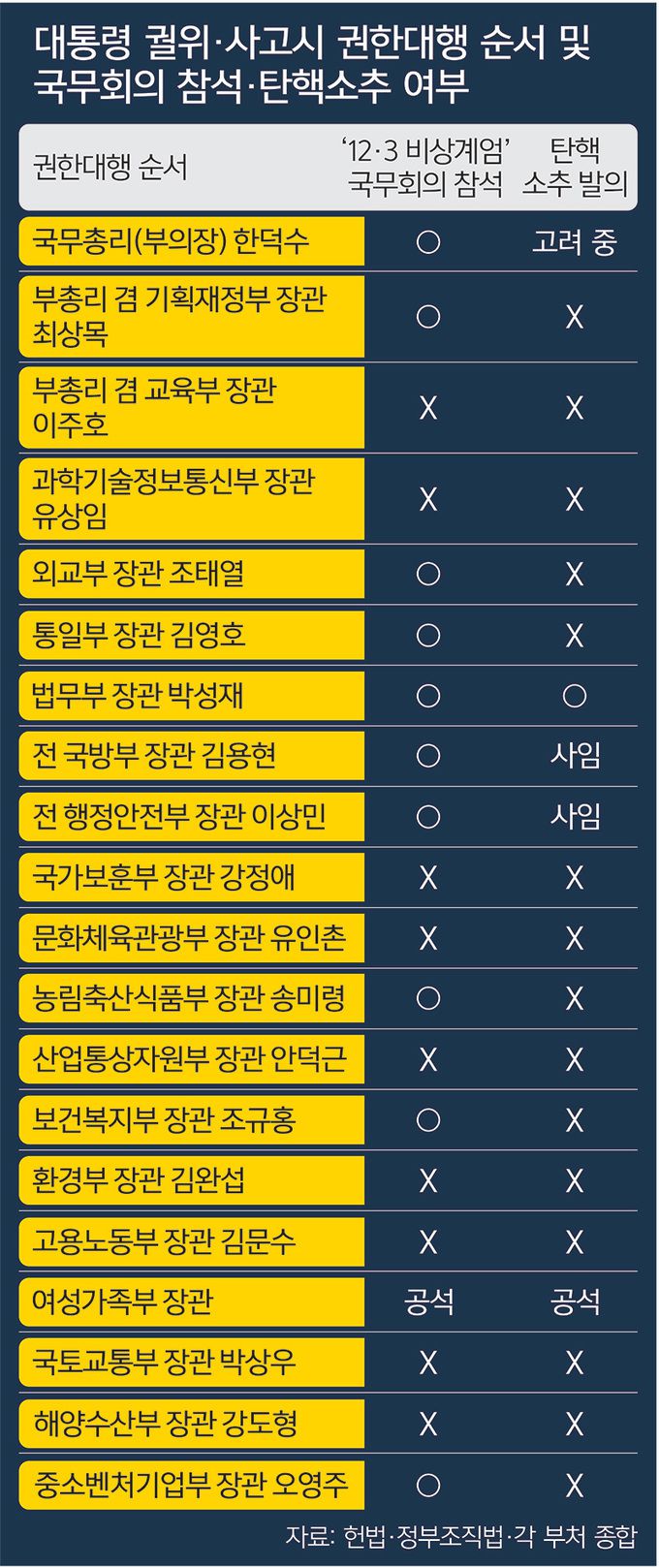 한 총리가 직무를 수행할 수 없을 경우에는 최상목 부총리 겸 기획재정부 장관, 이주호 사회부총리 겸 교육부 장관, 유상임 과기정통부 장관, 조태열 외교부 장관 등의 순서로 대행을 하게 되는 것이다. 이 중 최 부총리는 12·3 비상계엄 선포 국무회의에 참석했으나 비상계엄에 반대했다는 입장이고 이 부총리는 해당 국무회의에 불참했다.