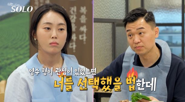 옥순은 "그건 네가 미안해 할 게 아니다. 어차피 (내 1픽인) 영수가 날 안 선택했잖아"라고 답했다. 그러자 광수는 "아, 그렇네. 너한테 관심이 있었으면 널 선택했을 법한데"라고 받아쳐 3MC 데프콘-이이경-송해나를 속 터지게 만들었다. 결국 폭발한 옥순은 "넌 이기적인 불도저 같다. 그건 좀 별로야"라고 돌직구를 던졌고, 두 사람은 무거운 침묵 속 식사를 마쳤다.