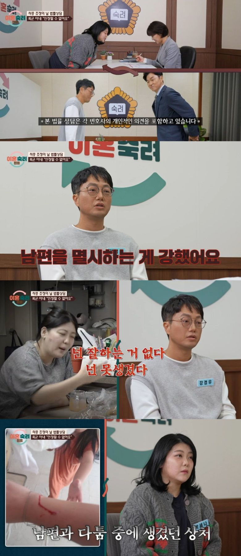 모멸감에 욕과 폭행이 나올 수밖에 없었다고 변명한 남편은 "폭행은 솔직히 안 했다. 끌어당기면서 상처가 났다"고 덧붙였지만 변호사는 "그것도 폭행"이라며 한숨을 쉬었다.