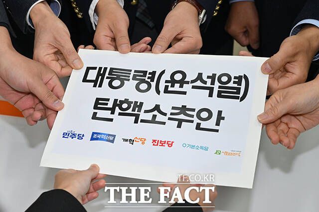 천하람 개혁신당 원내대표와 한창민 사회민주당 대표, 김용민 더불어민주당 의원, 윤종오 진보당 원내대표, 정춘생 조국혁신당 의원(왼쪽부터)이 12일 오후 서울 여의도 국회 의안과에서 '대통령(윤석열) 탄핵소추안'을 제출하고 있다. /박헌우 기자 |