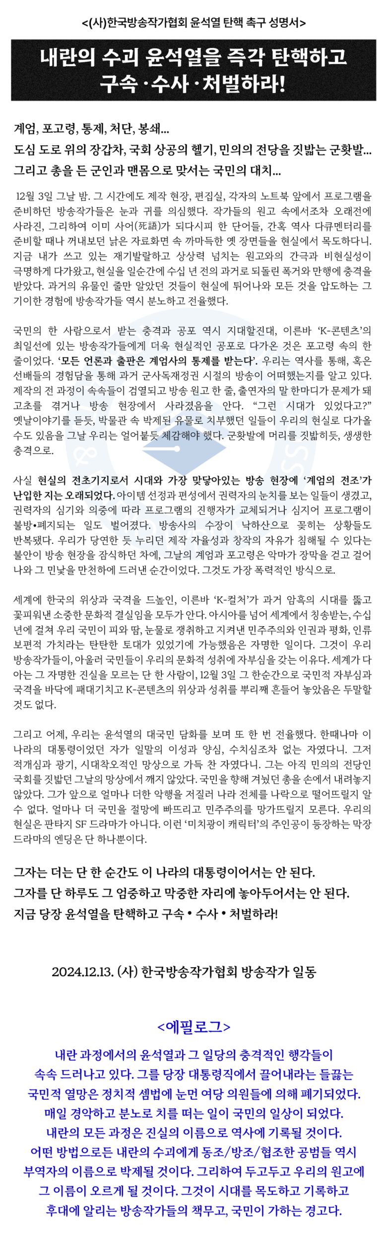 <(사)한국방송작가협회 윤석열 탄핵 촉구 성명서>