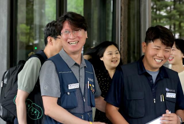 김득중(앞줄 왼쪽) 전국금속노동조합 쌍용자동차지부장이 지난해 6월 15일 오전 서울 서초구 대법원에서 나오며 밝게 웃고 있다. 뉴시스