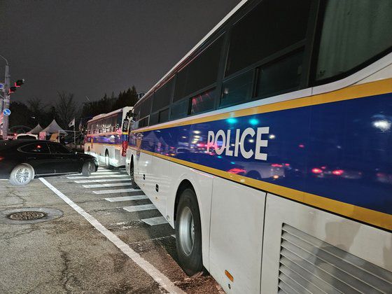 3일 비상계엄령 선포 이후 국회 앞에서 기동대 경찰이 버스로 차벽을 만든 뒤 대기하고 있다. 이수민 기자