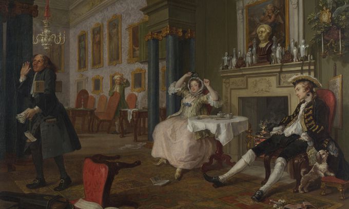 “윌리엄 호가스(1697∼1764)는 영국의 화가이자 사회비평적 풍자화가이다. 1743년부터 1745년 사이에 그는 ‘요즘의 결혼(Mariage a la mode)’이라는 연작 여섯 편을 그렸는데, 이 작품은 현재 런던 국립미술관에 전시되어 있다. 이 작품에서는 귀족의 도덕적인 삶이라는 신화를 까발리고 중매결혼과 그 이후 결혼생활을 징그러울 정도로 잔인하게 풍자했다. 정교하게 기획된 이 연작은 ‘혼인 합의’, ‘나란히 앉은 부부’, ‘검진’, ‘아침 단장’, ‘백작의 죽음’, ‘백작부인의 죽음’의 순서로 한 망나니 귀족의 정략결혼, 바람과 도박으로 얼룩진 엉망진창인 결혼생활, 치정에 따른 남편의 죽음과 뒤이은 부인의 비참한 자살에 이르기까지 돈과 사회적 신분 상승을 위한 정략결혼의 막장극을 보여준다.”(159쪽)