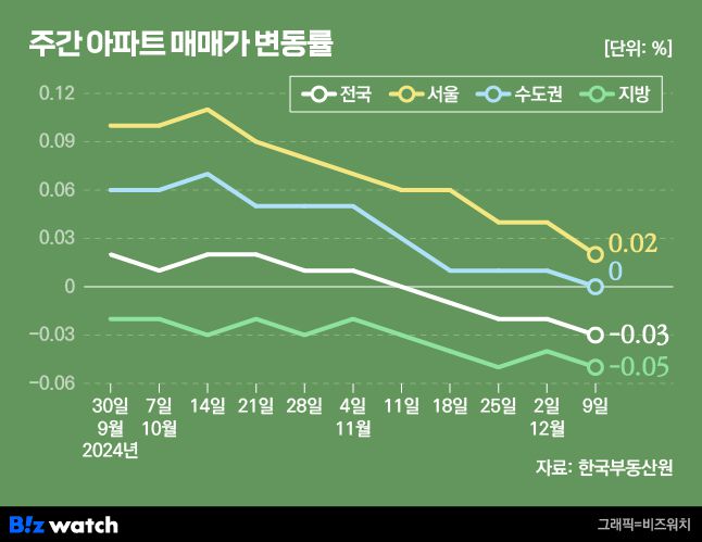 한국부동산원의 주간아파트매매가격지수 변동률에 따르면 12월 둘째주(9일 기준) 전국 아파트 매매가격은 0.03% 하락했습니다. 전주(-0.02%)보다 하락폭이 커진 겁니다.