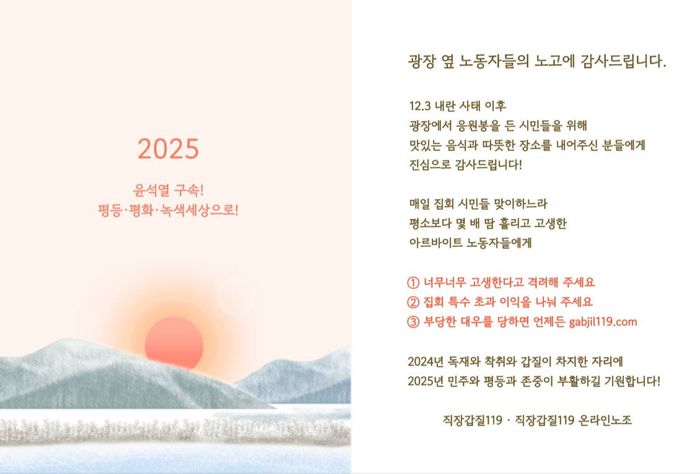 직장갑질119와 온라인노조는 “2017년 촛불항쟁은 국정농단 주범 박근혜를 탄핵·구속시켰다. 하지만 촛불정부를 자임한 문재인 정부는 노동자들의 간절한 요구인 상시업무 비정규직 사용 금지, 모든 사업장 근로기준법 적용, 노조법 2·3조 개정 등 직장인들의 간절한 요구를 외면했다”고 밝혔다. 이어 “윤석열이 감옥에 가고, 이재명이 대통령이 되면 직장인들의 삶은 달라질 수 있을까? 직장인들이 스스로 뭉쳐야 달라질 수 있다”고 했다.