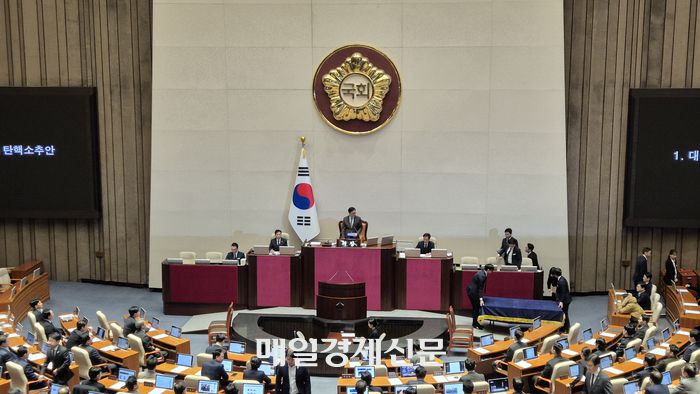 14일 오후 서울 여의도 국회에서 열린 제419회 국회(임시회) 제4차 본회의에서 ‘대통령(윤석열) 탄핵소추안’ 표결 결과가 발표되는 모습. 이날 윤석열 대통령의 탄핵안은 가결됐다. [이상현 기자] |
