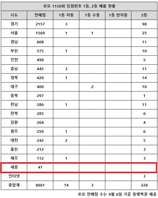로또당첨번호 1등과 2등의 당첨금 규모는 상당한 차이를 보이지만 동행복권은 고액 당첨자로 분류하는 가운데 1150회 로또 고액(1,2등) 당첨 판매점이 세종(41곳)에서는 단 한 곳도 나오지 않았다.