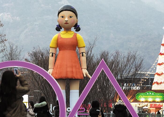 서울 광화문광장에 넷플릭스 드라마 ‘오징어게임’의 캐릭터 ‘영희’ 조형물이 등장했다. 16일 오후 광화문광장을 찾은 시민이 ‘영희’ 조형물을 촬영하고 있다.