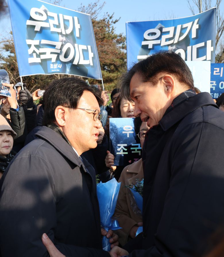 자녀 입시 비리와 청와대 감찰 무마 등 혐의로 기소돼 징역 2년 형이 확정된 조국 전 조국혁신당 대표가 16일 오전 경기도 의왕 서울구치소 앞에서 수감되기 전 황운하 조국혁신당 원내대표 와 인사하고 있다. [연합] |