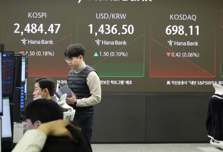 17일 서울 중구 하나은행 본점 딜링룸 현황판에 주식 시세가 표시돼 있다. 이날 코스피는 전장보다 1.66 포인트(0.07%) 내린 2,487.31로 출발했다. 코스닥지수는 0.99p(0.14%) 오른 699.52에, 원/달러 환율은 2.0원 오른 1437.0원에 개장했다. [연합] |