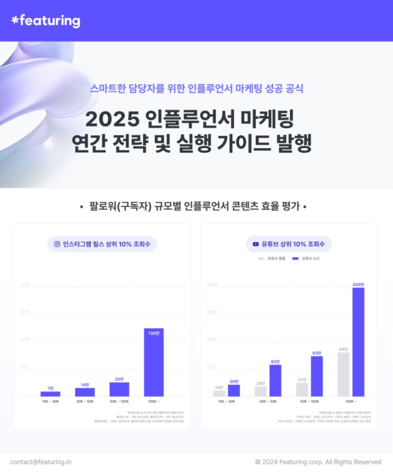 이번에 발행한 리포트는 3억 건 이상의 SNS 데이터를 실시간으로 수집·분석하는 피처링 AI 엔진과 1만2000개 이상의 고객사 협업 경험을 바탕으로 인플루언서 선정 기준, 인스타그램·유튜브 콘텐츠 예상 원고료, 인플루언서 계약 시 체크리스트, 마케팅 효율 성과 측정 지표 등 실무에 참고할 수 있는 정보를 수록했다.