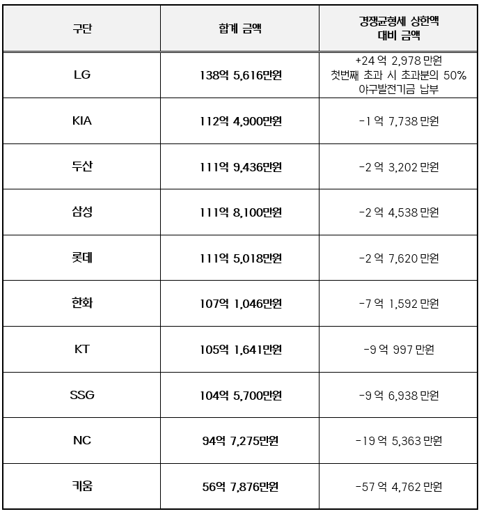 금액 집계 결과 LG는 상위 40명의 합계 금액이 138억 5,616만원으로 경쟁균형세 상한액 대비 24억 2,978만원이 초과돼, 해당 액수의 50%인 12억 1,489만원을 야구발전기금으로 납부한다.