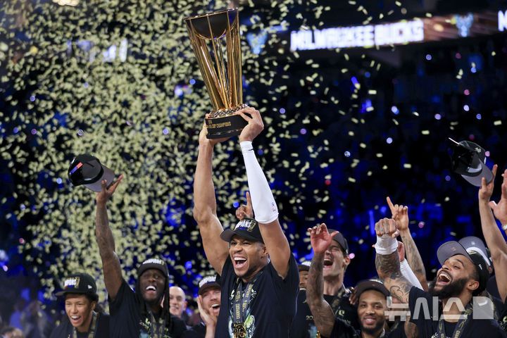 [라스베이거스=AP/뉴시스] 밀워키 벅스의 포워드 지아니스 아데토쿤보가 17일(현지시각) 미 네바다주 라스베이거스의 T모바일 아레나에서 열린 2024 미국프로농구(NBA) 컵 정상에 올라 트로피를 들고 동료들과 함께 환호하고 있다. 밀워키는 결승에서 오클라호마시티 선더를 97-81로 꺾고 우승했다. 2024.12.18.