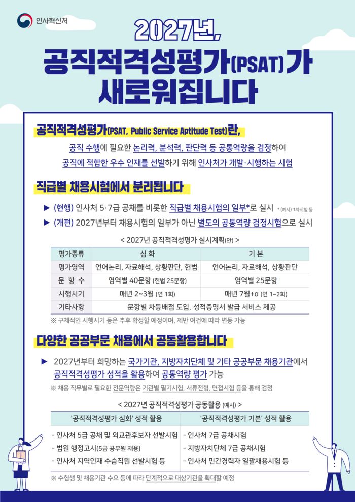 인사처는 여러 기관에서 함께 활용할 수 있도록 PSAT의 범용성을 높이는 방향으로 20년 만에 전면 개편한다. 2027년부터 한 번의 PSAT 응시로 지방직 7급뿐만 아니라 국가직 7급 시험 지원이 가능해진다. 공공부문의 채택 여부에 따라 활용처는 더 늘어날 수 있다.