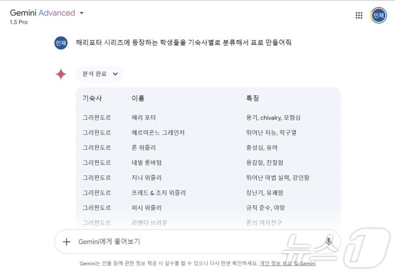 구글의 인공지능(AI) '제미나이'에 "해리포터 시리즈에 등장하는 학생들을 기숙사별로 분류하고 그 내용을 표로 만들어줘"라고 말하자 관련 정보를 일목요연하게 표로 정리했다. (제미나이 갈무리) 2024.12.18/뉴스1 |