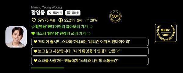 ID 상**는 "황영웅 가수님 최고 최고 응원합니다. 푹 빠져서 삽니다. 안보면 그립고 보면 항상 아쉬워서 애태우는... 매일매일 보고 살수는 없는 건가요? 핸드폰 속 영웅님 만 봅니다. 트로트 천재 목소리 천재님. 행복합니다. 진짜 남자 멋진 남자 예쁜남자 귀여운 남자 멋진 노래 감사합니다. 언제까지나 당신 편입니다. 가을 끝까지 사랑합니다 어여어여 넘어가다오 있을 때 없을 때 모두사랑합니다 황영웅님. 브라보 브라보입니다"라고 응원글을 남겼다.