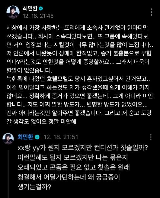 이날 최민환은 "회사에 소속돼있다 보면 또 그룹에 속해있다 보면 저의 입장보다는 지킬 것이 너무 많다는 것을 많이 느낀다"며 "언론에서 나왔듯이 성매매 한 적 없고, '증거 불충분으로 무혐의다' 라는 것도 안 한 것을 어떻게 증명할까요. 그래서 더욱이 할 말이 없었다"고 억울함을 호소했다.