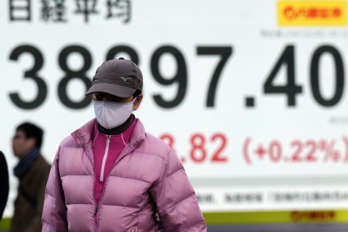 20일 도쿄의 한 증권사 시세 전광판 앞을 시민들이 지나가고 있다. AP연합뉴스 |