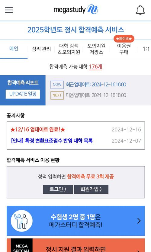 메가스터디교육이 올해 대입에 맞춰 성적 분석과 실시간 지원 변화 패턴 등을 대폭 업그레이드한 '2025 정시 합격예측 서비스' 를 제공한다.