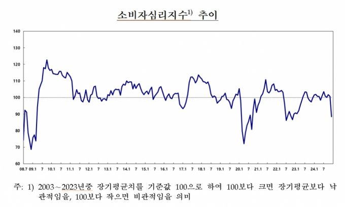 이달 소비자심리지수는 지난 5월(98.4) 이후 7개월 만에 100아래로 내려가며 '비관적'으로 돌아섰다. 한은은 정치 불확실성이 커진 데 따른 소비자심리 위축과 국내 금융시장 변동성 확대 등으로 지수가 하락했다고 설명했다. 이달 소비자동향조사는 지난 10일부터 17일까지 진행돼 계엄 사태를 반영했다.