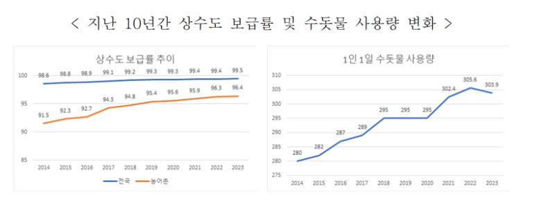2023년 상수도 통계 조사 결과 급수인구는 5238만 5000여 명이며, 전국과 농어촌지역 상수도보급률은 2014년 각각 98.6%, 91.5%에서 2023년 99.5%, 96.4%로 지난 10년간 지속적으로 상승한 것으로 나타났다.